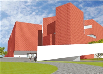 而这一次,树立在美院一角的这栋设计博物馆,将以跳脱的印度红呈现在大家面前。而它的形状,像一把折成三段的尺子。
