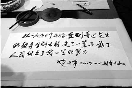 这一想还真是仔细了。他特地跟着讲解员听完所有展品背后的小故事,才回到写字台前。当众人以为他会写几个大字完事,没想到赵延年拿起毛笔洋洋洒洒写了一大段话:“从1940年开始受到鲁迅先生的教导,学刻木刻,走了一辈子,为了人民付出了我一生的努力”。